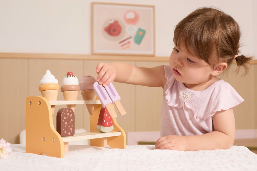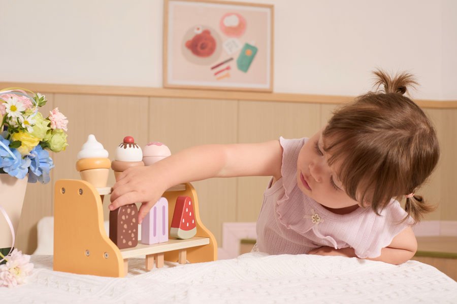 Очарователният дървен щанд за сладоледи PolarB е създаден за малките любители на ролевите игри. С нежни пастелни цветове, изчистен скандинавски дизайн и напълно безопасни, заоблени форми, този комплект превръща играта „на магазин“ в истинско удоволствие.
