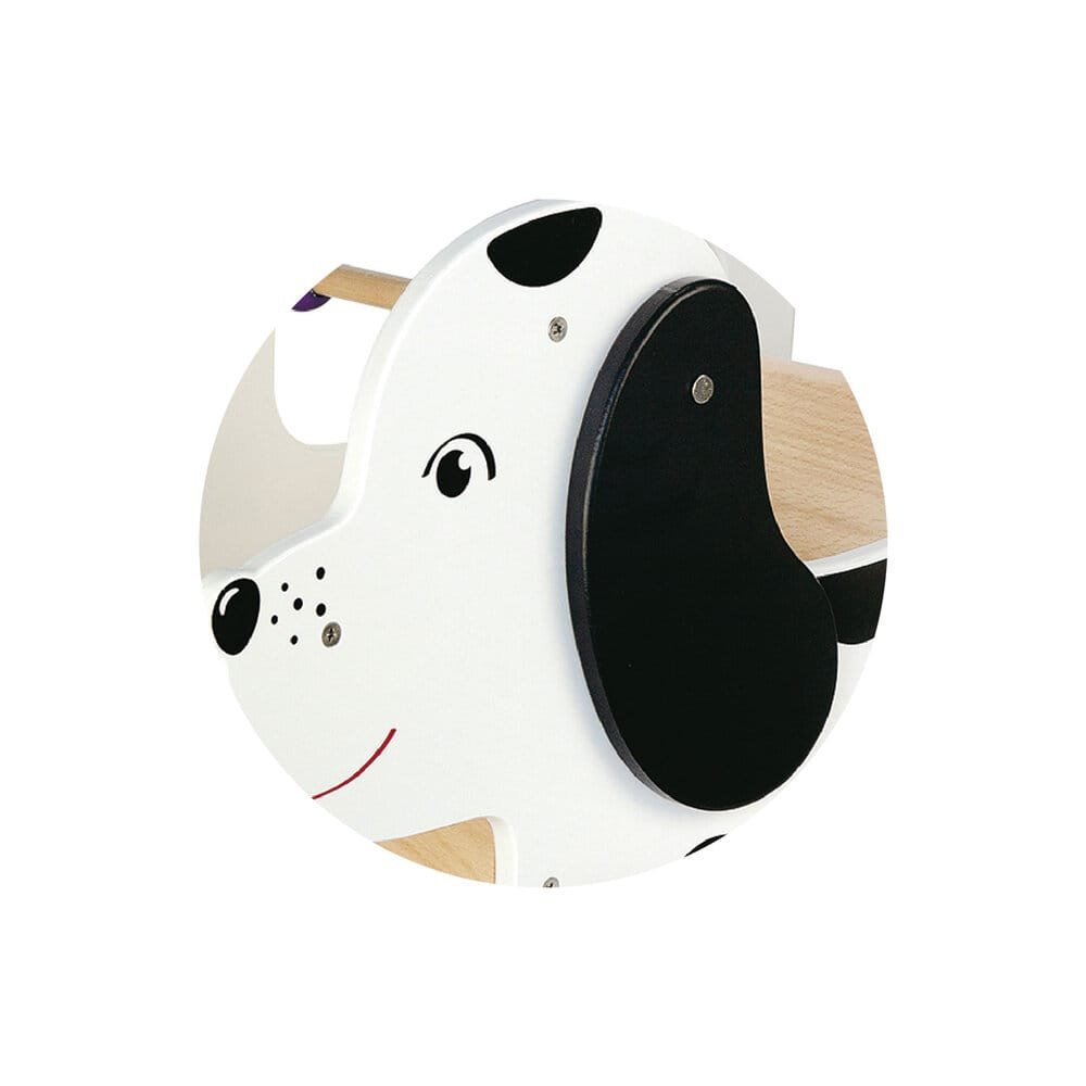 Дървена проходилка „Куче“ представлява количка от шпертплат, която се отличава със своята стабилност и здравина. Черните уши на кучето се въртят, което прави уолкъра забавен за детето. Отпред са монтирани разноцветни рингове. Те привличат вниманието на детето и спомагат развитието фината моторика на пръстите. Проходилката е изработена така, че детето да има възможността да се качва в нея и да бъде возено. След прохождането му дъвената проходилка се превръща в удобна количка за детски играчки, кукли, кубчета.