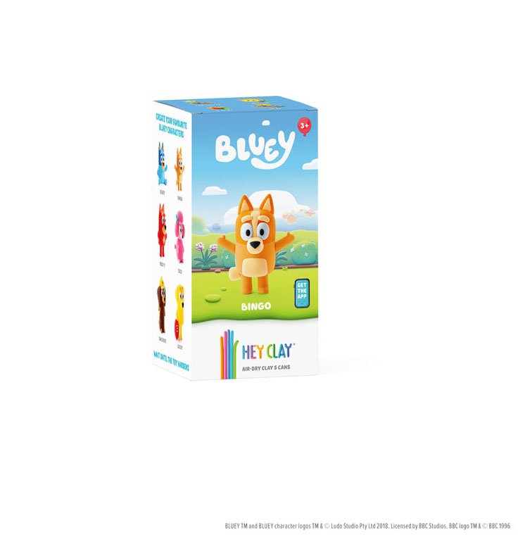 Комплектът Глина за моделиране Bingo HEY CLAY включва 5 глинени кутийки в тематични цветове, 5 цвята глина, 1 инструмент за моделиране и инструкции за скулптуриране на Bingo в приложението HEY CLAY. Глината е мека, безопасна и лесна за работа, като след изсъхване героите се превръщат в здрава играчка, която може да бъде показана или използвана за ролеви игри.