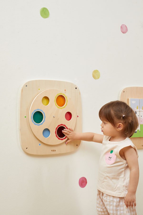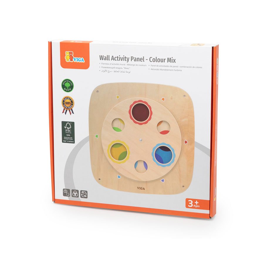Монтесори стенният панел „Смесване на цветове“ от VIGA Toys е забавна и образователна игра, която развива визуално възприятие, цветоразпознаване и логическо мислене. Панелът съдържа голям въртящ се дървен диск с цветни филтри и прозорчета. Когато детето завърта диска, цветовете се припокриват и създават нови нюанси – интересен начин за запознаване с основните и смесените цветове.