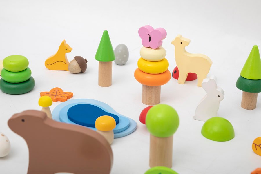 Комплектът съдържа 58 дървени елемента, включващи горски животни (мечка, елен, лисица, таралеж, заек), дървета, гъби, камъчета, вода и природни форми. Разнообразието от цветове, форми и текстури приканва децата да подреждат, сортират, строят и да създават свои собствени горски светове и приказни истории.