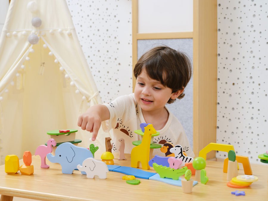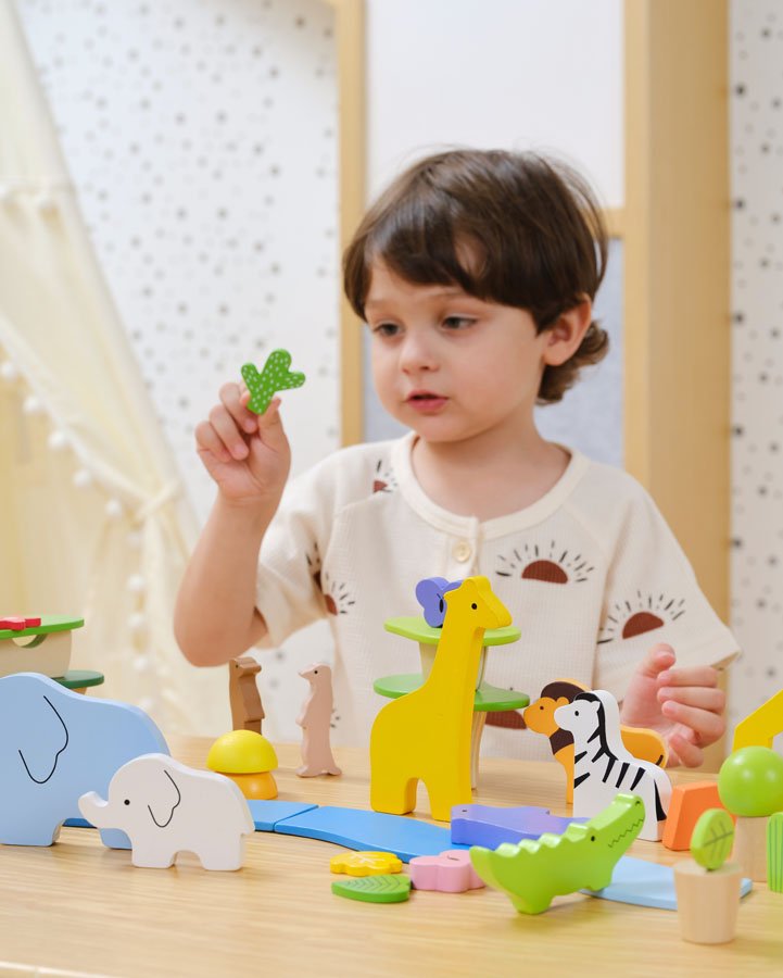 Комплектът включва 55 дървени елемента с тропическа тематика – слонове, жирафи, фламинго, зебри, както и природни елементи като дървета, вода и слънце. Разнообразните форми, цветове и текстури приканват децата да подреждат, сортират, комбинират и създават собствени тропически светове и приказни истории.