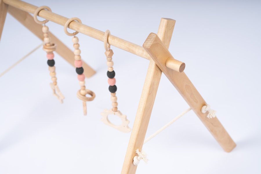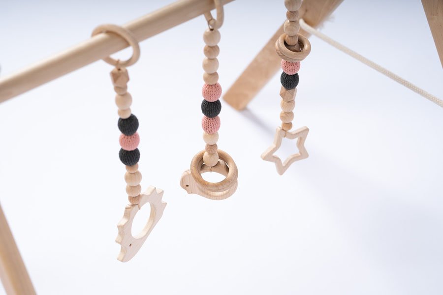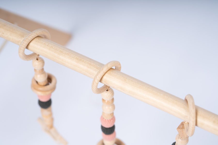 Висящите играчки с различни форми, топчета и рингове стимулират зрителното възприятие и привличат вниманието на бебето. Комбинацията от естествено дърво и меки цветови акценти подпомага: