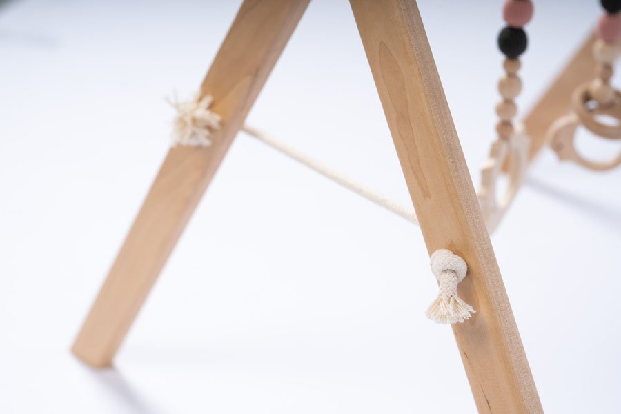Тази стилна бебешка гимнастика от естествено дърво е създадена не само с внимание към дизайна, но и с грижа за ранното детско развитие. Висящите играчки и декоративните елементи са в розови, неутрални и естествени тонове, които създават спокойна и приятна среда за бебето по време на игра.