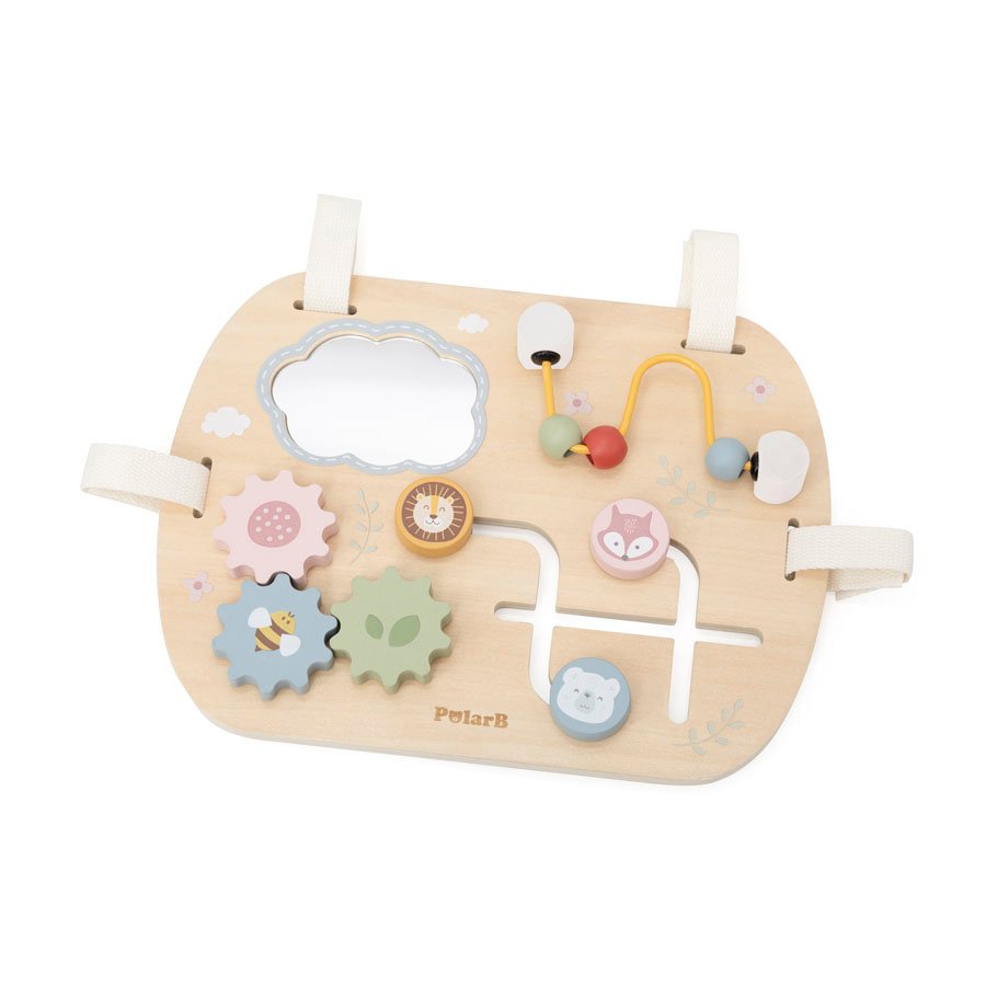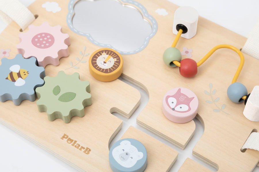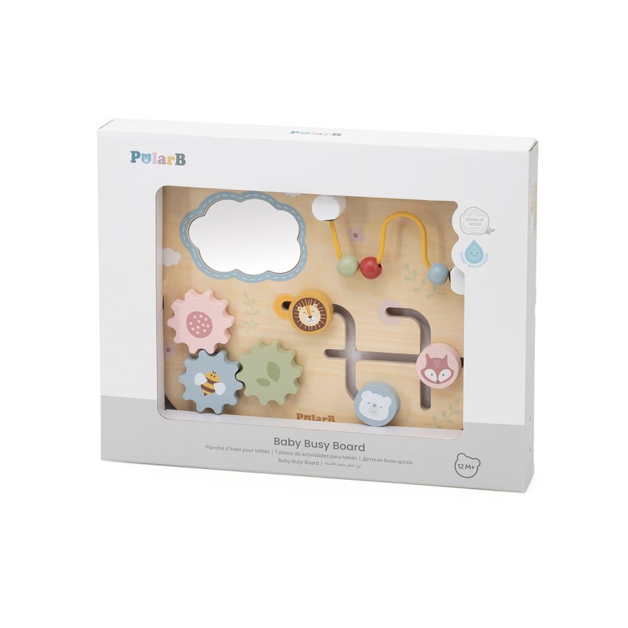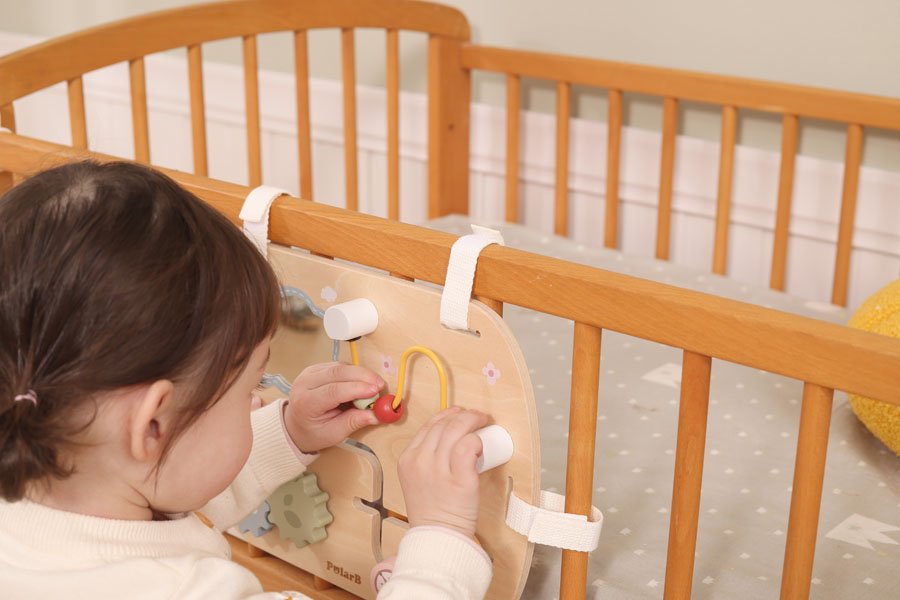 Бизибордът PolarB е компактен, красиво изработен дървен панел за ранно детско развитие, който превръща ежедневните моменти у дома в полезна игра. Елементите са монтирани върху стабилна дървена основа, а бизибордът се закрепя бързо и лесно с текстилни ленти – към детски легла, кошари за игра и решетки, а при удобна позиция и към количка (под наблюдение).