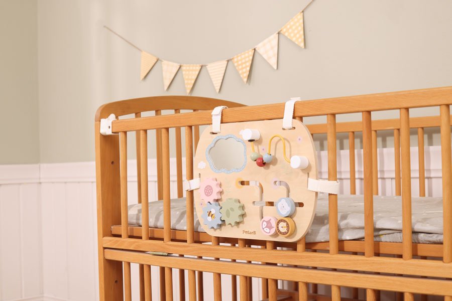 Детският дървен бизиборд е изключително удобен за монтаж. Лесно се закрепва с ленти към решетки на легло или кошара за игра.
