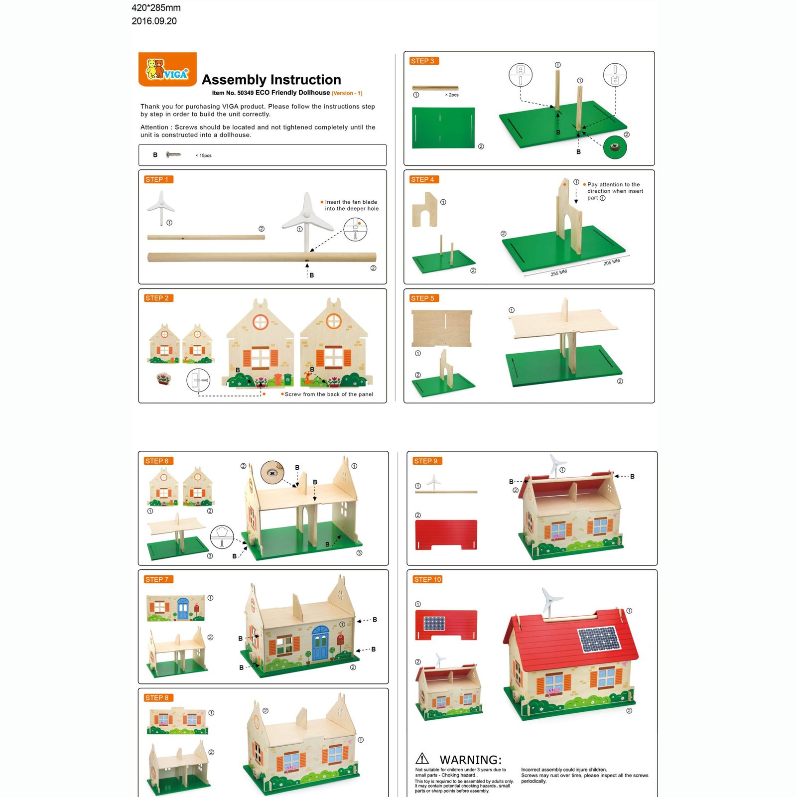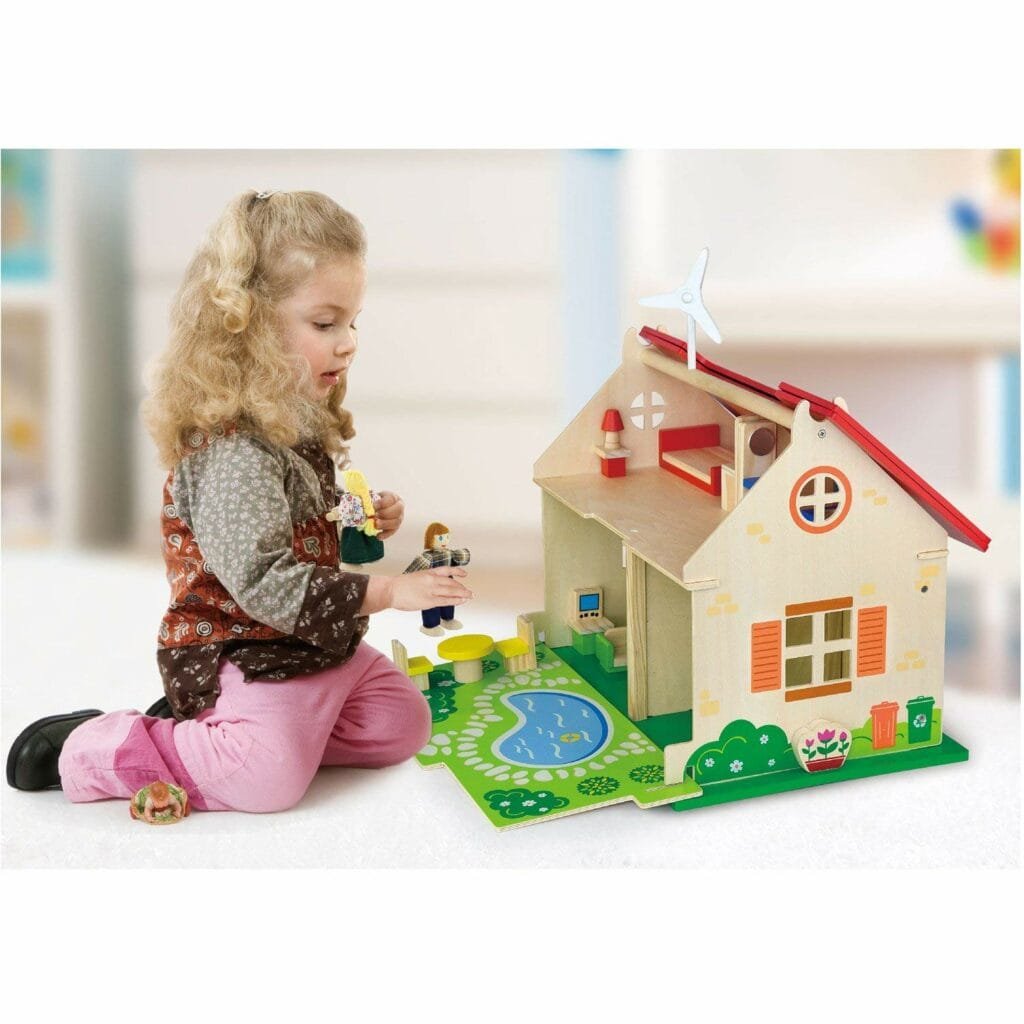 Дървена къща за кукли съдържа комплект с обзавеждане на четири стаи и двете важни фигури от семейството. Покривът и лицевият панел лесно се демонтират и функционалността на къщата се разширява. Покривът на дървената къща е с панели и вятърна турбина за електрическа енергия.
