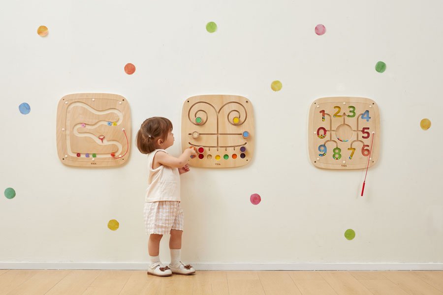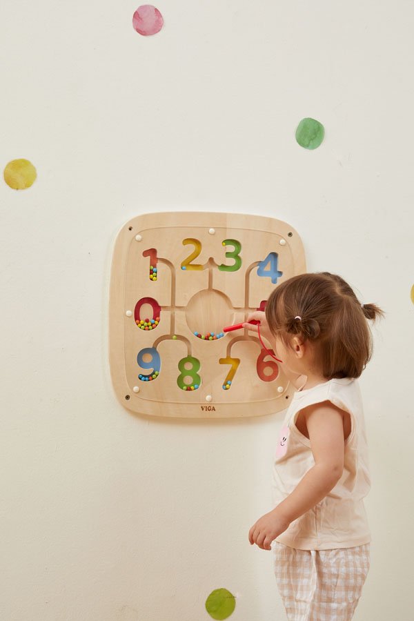 Магнитният дървен стенен панел с цифри от VIGA Toys е чудесен помощник в първите стъпки на децата към света на математиката. Играчката представлява стенен образователен лабиринт с цифри от 0 до 9 и цветни магнитни топчета, които детето придвижва с магнитна писалка. Всеки номер е оцветен в различен цветове за по-лесно запомняне и визуално разграничаване.