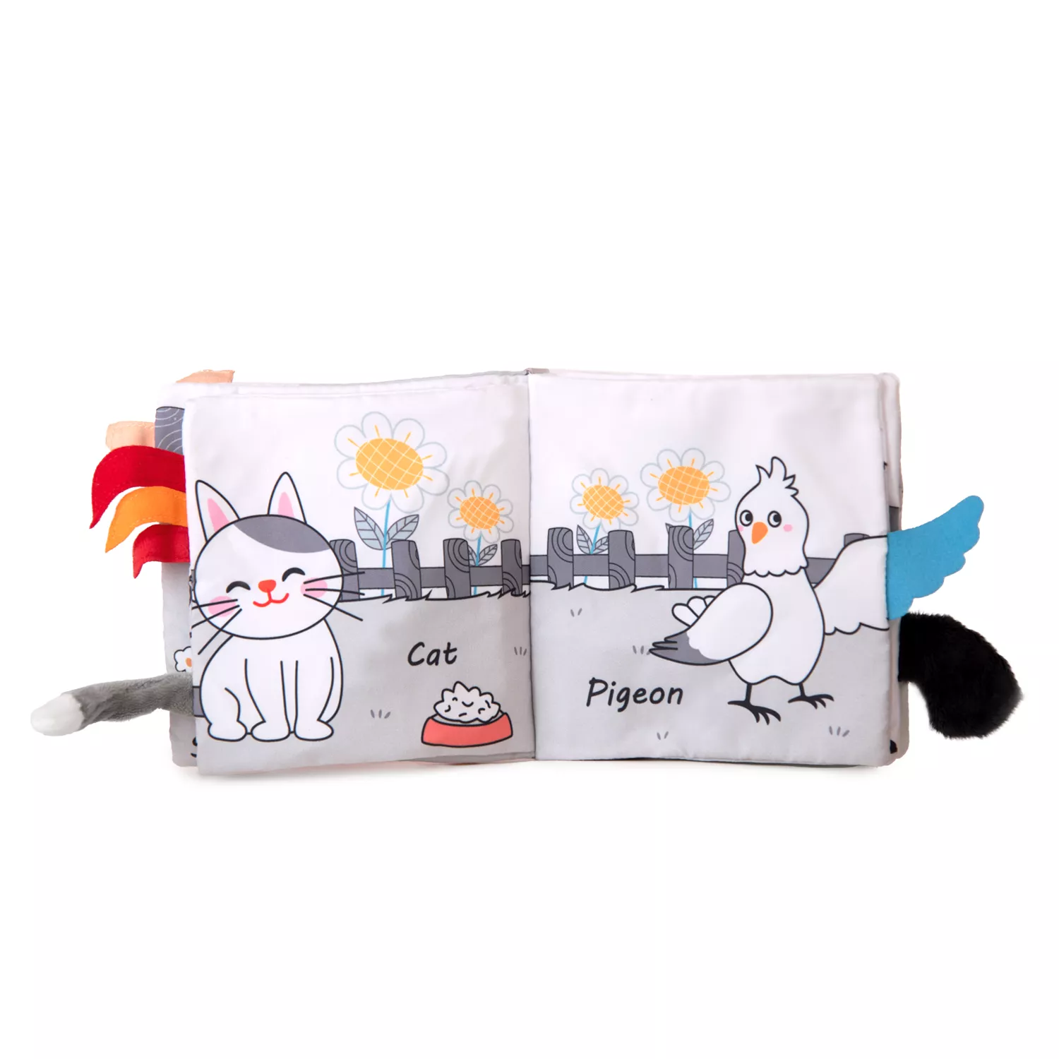 Корицата впечатлява с 3D кученце с меки ушички, които са подходящи за стискане и игра. Вътрешните текстилни страници разкриват различни животни, а стърчащите опашки и крилца приканват детето да дърпа и открива кое на кого принадлежи – забавен начин за стимулиране на координацията и фината моторика.