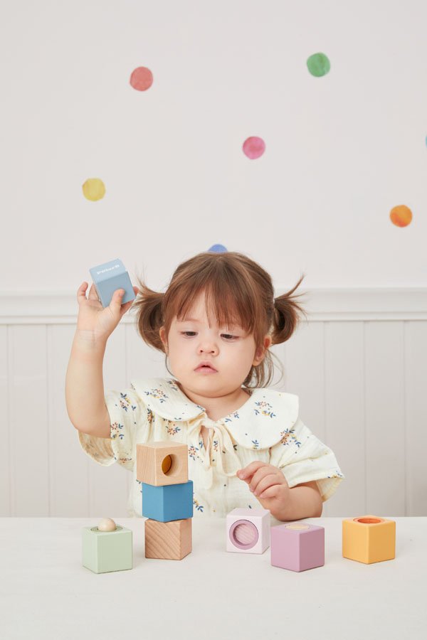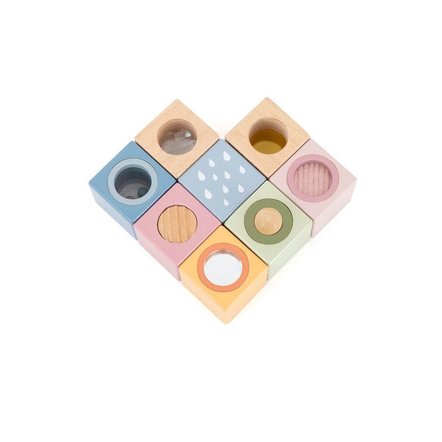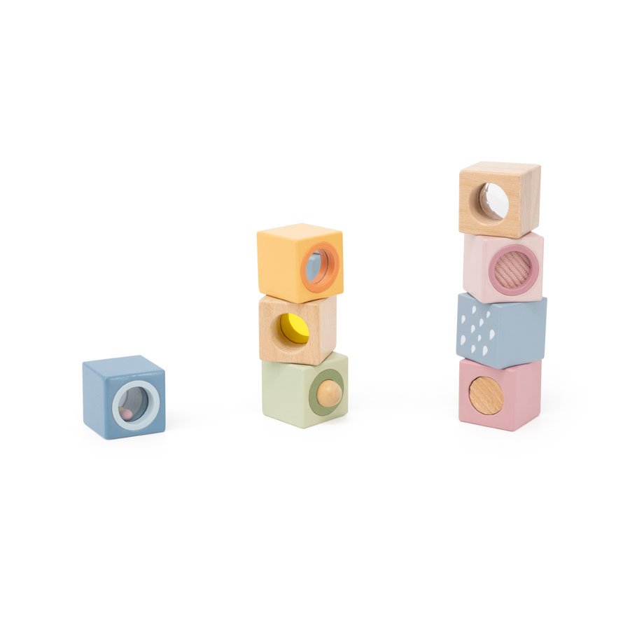 Това е комплект от образователни Дървени Монтесори кубчета за деца, създадени специално за ранно детско развитие и стимулиране на сетивата. Всеки куб е с различен сензорен елемент – топче, огледалце, прозорче, цветен филтър, звук или текстура, което превръща играта в изследване и откривателство. Тези сензорни блокчета насърчават естественото учене чрез докосване, наблюдение и експериментиране, а пастелните цветове създават спокойна и привлекателна игрова среда.
