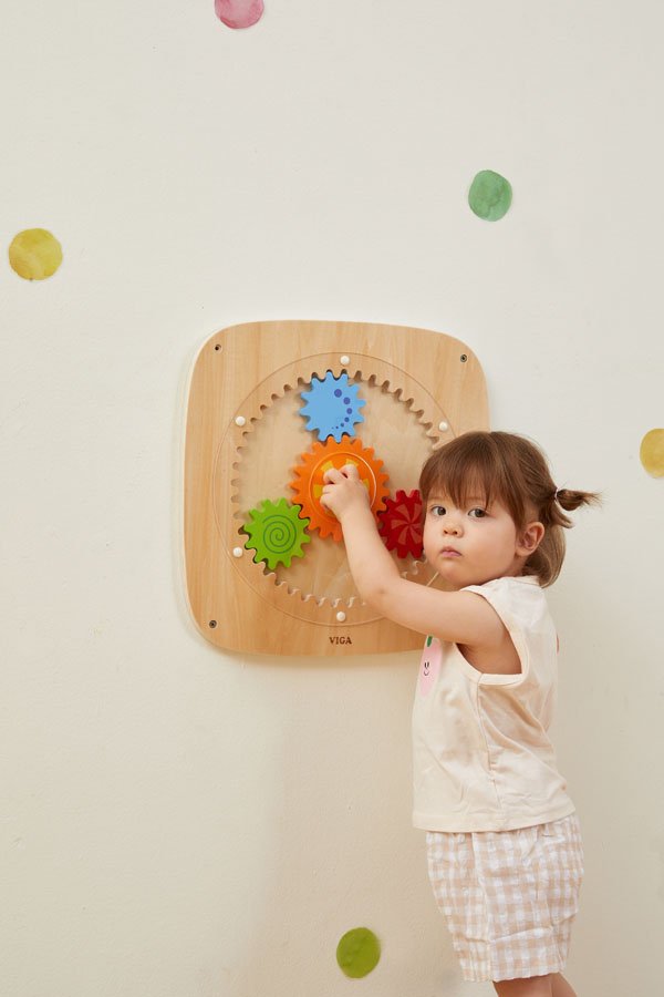 Дървеният стенен панел със зъбни колела от VIGA Toys е интерактивна образователна игра, която стимулира детето да изследва движението, причинно-следствените връзки и механиката. Въртенето на централното колело посредством удобната дръжка задвижва останалите, което превръща играта в забавно изследване на движение и посока.